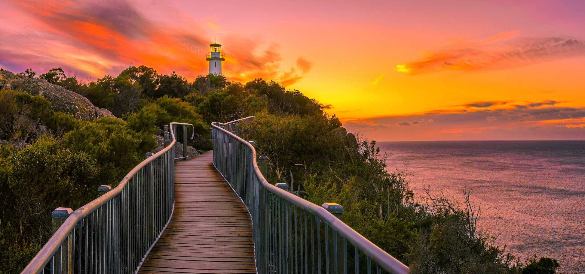 panorama-210 XXL Leinwandbilder inklusive Holzrahmen Leuchtturm Holzweg Sonnenuntergang Naturfotografie Reiseziele Küstenlandschaft Landschaftsfotografie Wanderlust Meerblick Traumhaft