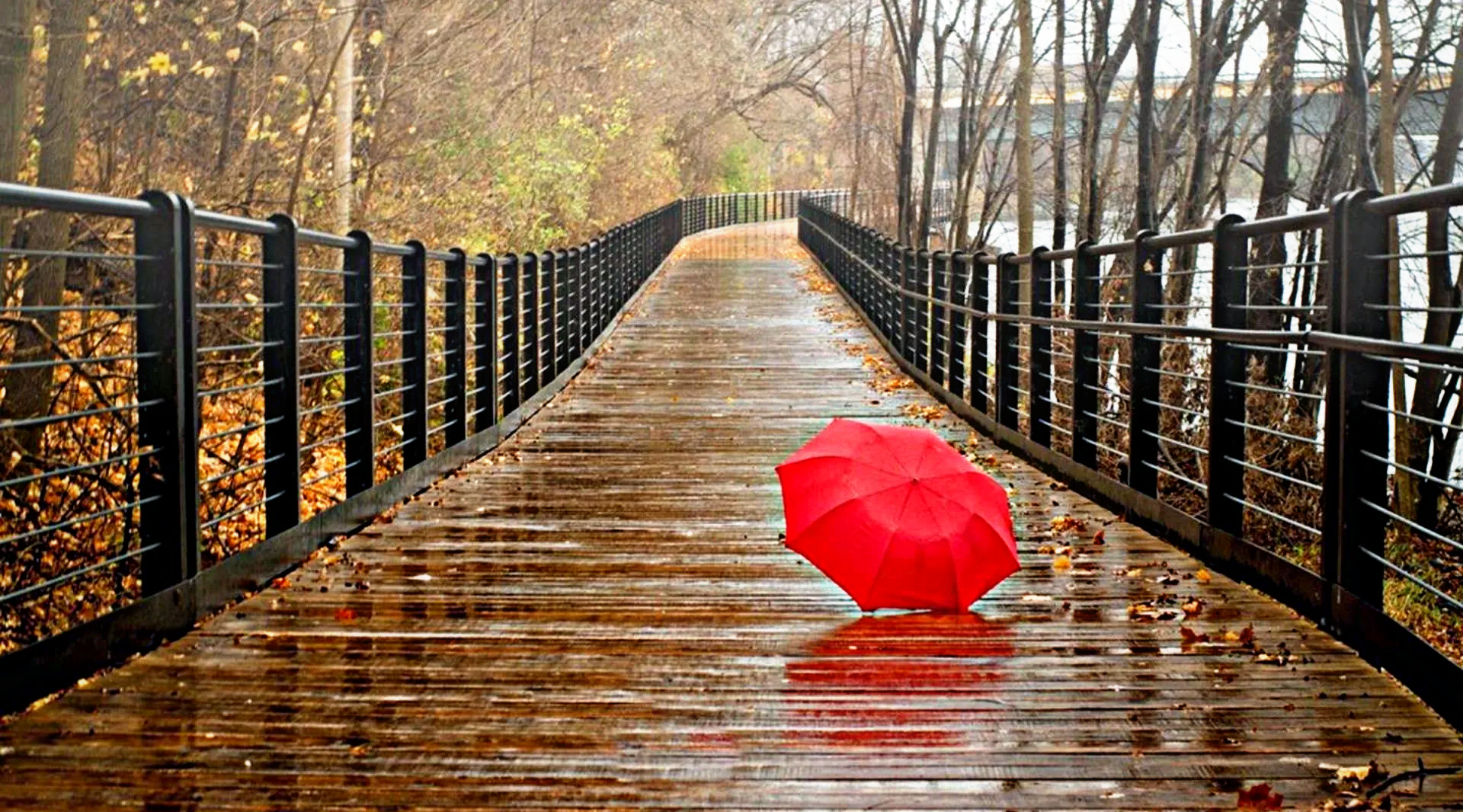 X743 - XXXL LEINWANDBILDER INKLUSIVE HOLZRAHMEN - roter Regenschirm nasser Weg Regentage Herbststimmung Stadtleben Wetterfotografie Farbenfroh Natur und Stadt FotografieLiebe