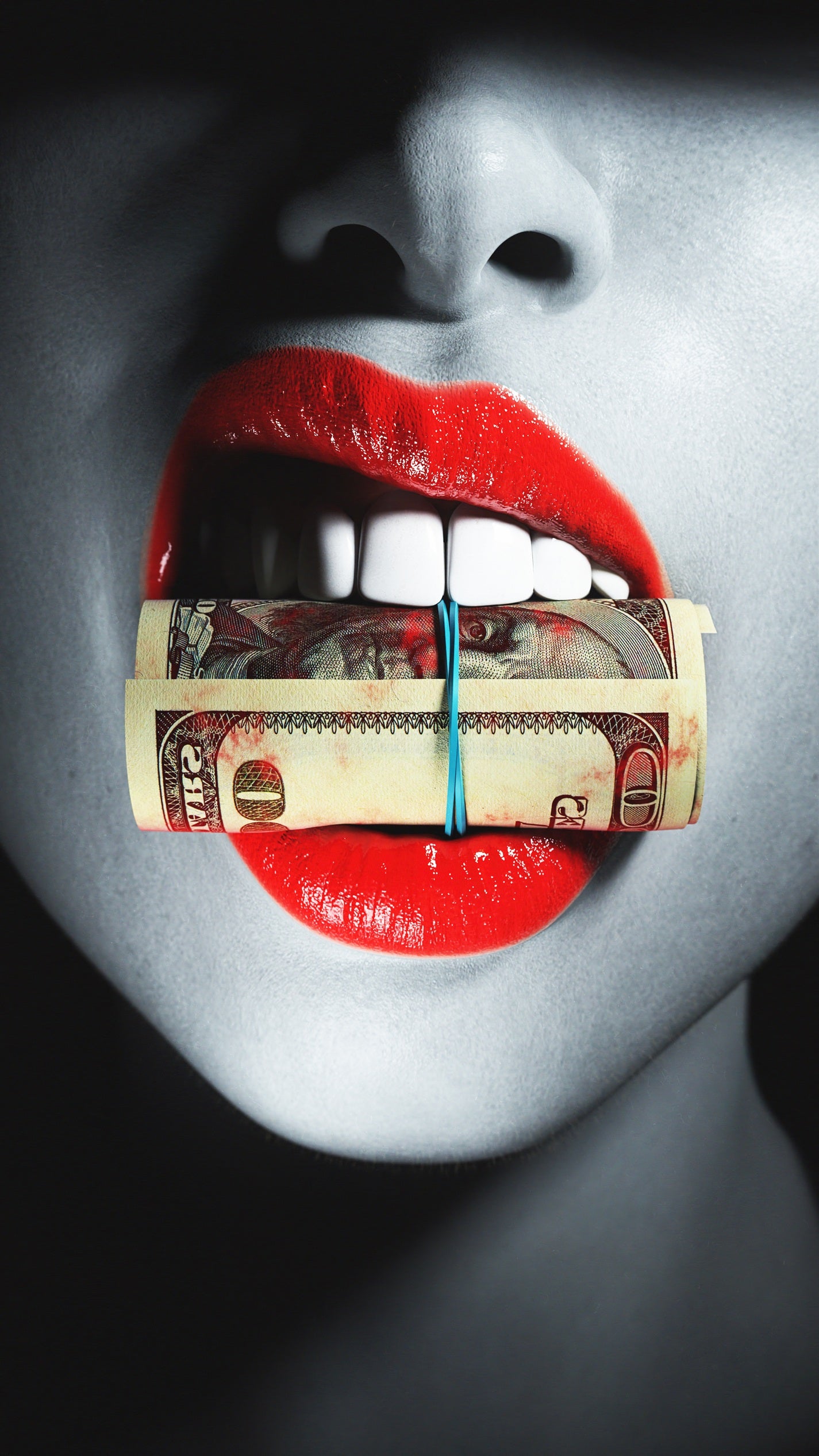 X763 - XXXL LEINWANDBILDER INKLUSIVE HOLZRAHMEN Rote Lippen Geld Frau Luxus Geldscheine Beauty Lifestyle Selbstbewusstsein Glamour Kreativität